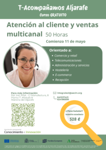 La Asociación Empresarial Conocimiento e Innovación AECIN, como entidad beneficiaria del programa T-Acompañamos Aljarafe, enmarcado dentro de los Proyectos Integrales de Inserción Laboral, anuncia el lanzamiento de una acción formativa gratuita dirigida a mejorar la empleabilidad de personas desempleadas en búsqueda activa de empleo. Se trata del curso “Atención al Cliente y Ventas Multicanal”, con una duración total de 50 horas, que dará comienzo el próximo 13